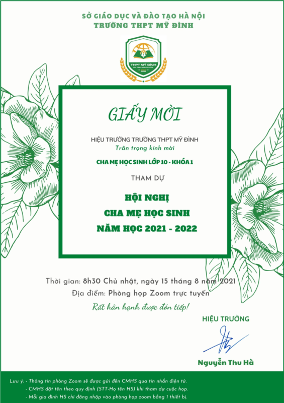Mỗi gia đình học sinh chỉ đăng nhập vào phòng họp bằng 01 thiết bị. CMHS vui lòng đặt tên theo quy định khi vào dự họp (STT-Họ tên HS), chi tiết xem tại Danh sách đính kèm Giấy mời này.